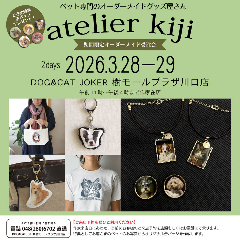 DOG&CAT JOKER 樹モールプラザ川口店にてオーダーメイド受注会を開催 イベント 2026.03.23 今週末3月28日、29日はJOKER 樹モールプラザ川口店にてオーダー会です。 11時から16時まで店頭におりますので、お気軽にお声がけください。 ジワジワ人気のノーブルブローチ(姫様や王子へ変身するアイテム)大変好評です!